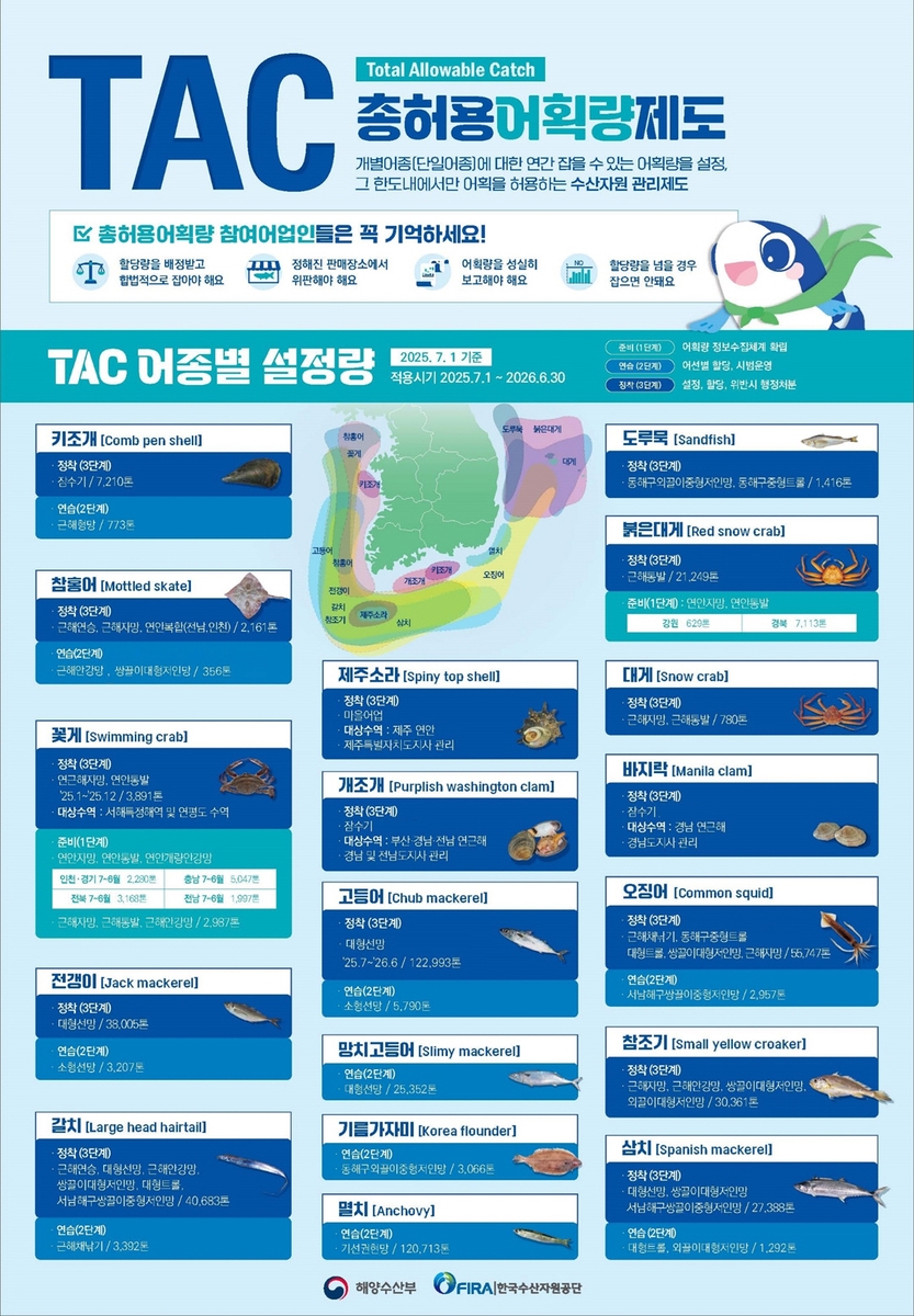 | 2001 | 4/7 | 고등어(대형선망), 전갱이(대형선망), 정어리(대형선망), 붉은대게(근해통발), 제주소라(마을어업), 개조개(잠수기), 키조개(잠수기) | 업종 2개, 어종 3개 추가 |